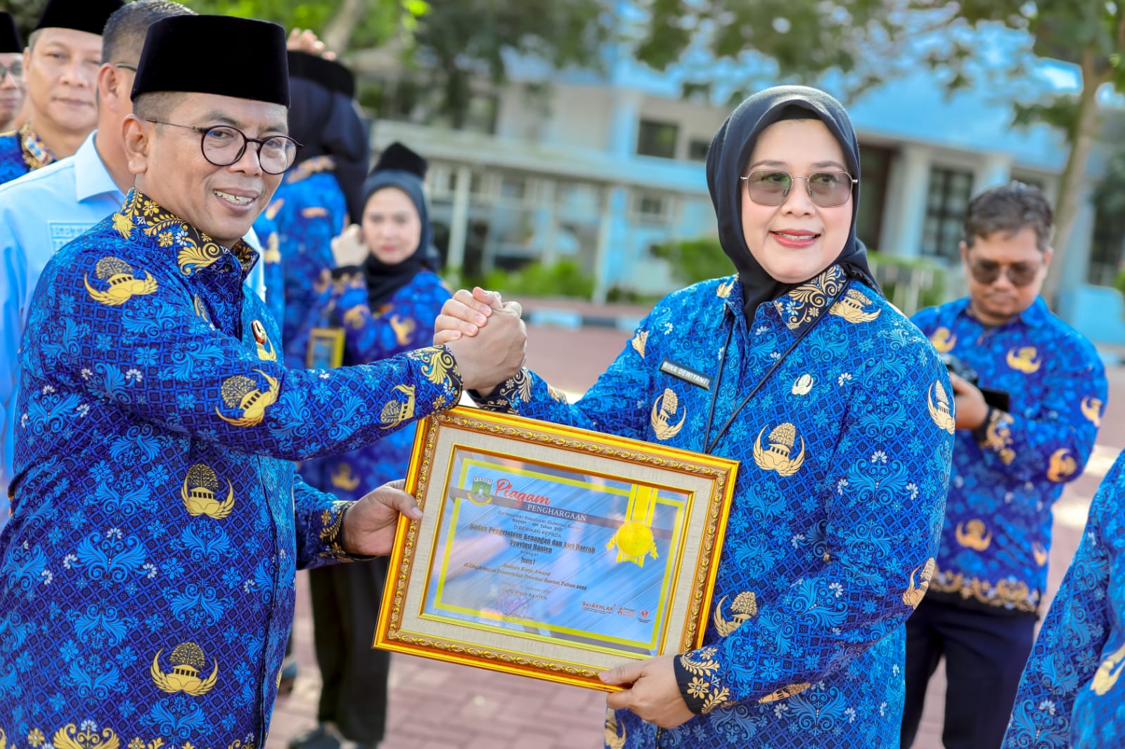 “Puji syukur Alhamdulillah saya ucapkan kepada Bapak/Ibu sekalian. Bahwa dalam rangka mengapresiasi perangkat daerah yang mengimplementasikan core values ASN BerAKHLAK — berorientasi pelayanan, akuntabel, kompeten, harmonis, loyal, adaptif, dan kolaboratif — BPKAD dinilai sebagai Pemenang Peringkat 1 Budaya Kerja Award Pemerintah Provinsi Banten Tahun 2025,” tutur Rina.