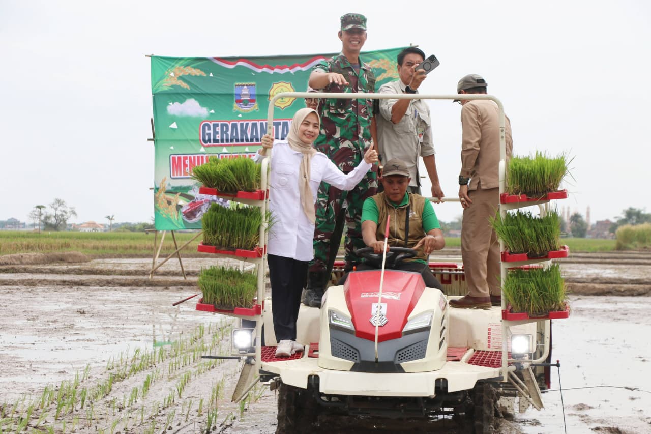 Tak sendirian, dikemudikan operator Ratu Zakiyah menaiki Transplanter bersama Tenaga Ahli Menteri Pertanian Bidang Pemanfaatan Sumberdaya Lahan Marginal, Anny Mulyani, Kepala Dinas Pertanian (Distan) Provinsi Banten, Agus M Taucid, dan Komandan Distrik Militer (Dandim) 0602/Serang, Letkol Arm Oke Kistiyanto.