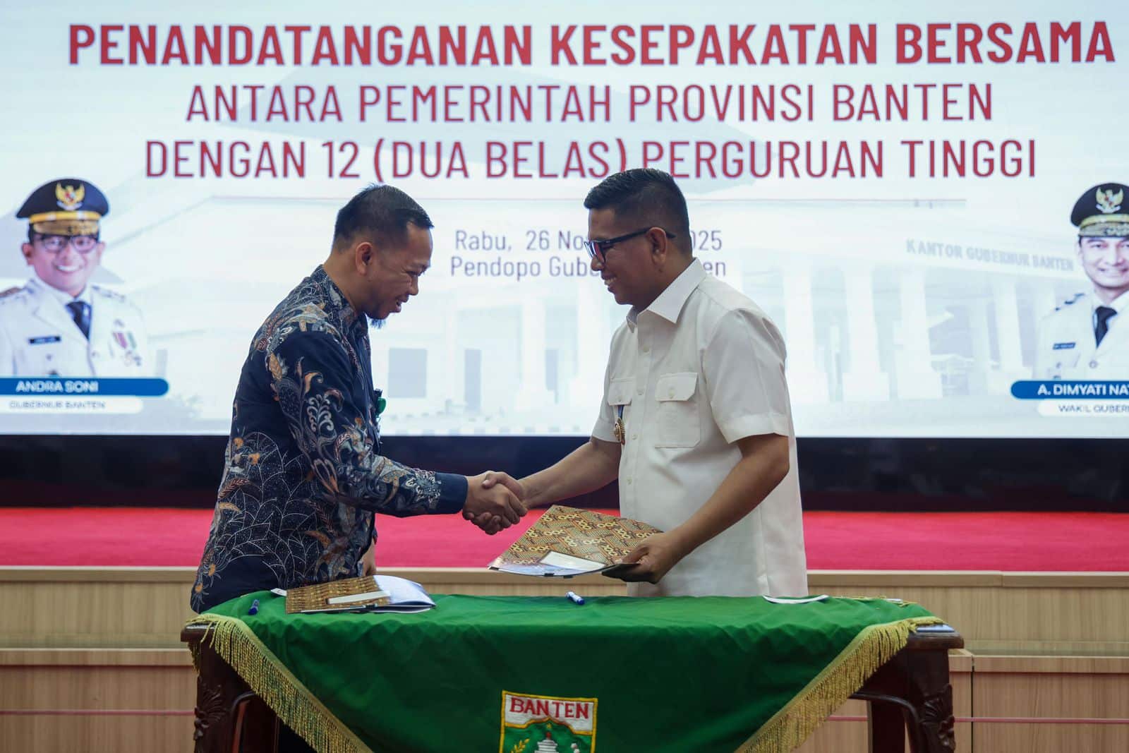 “Dalam konteks inilah, perguruan tinggi memegang peran yang sangat strategis sebagai pusat ilmu pengetahuan, penelitian dan inovasi,” kata Andra Soni usai Penandatanganan Kesepakatan Bersama antara Pemerintah Provinsi Banten dengan 12 perguruan tinggi di Pendopo Gubernur Banten, KP3B, Kota Serang, Rabu (26/11/2025).