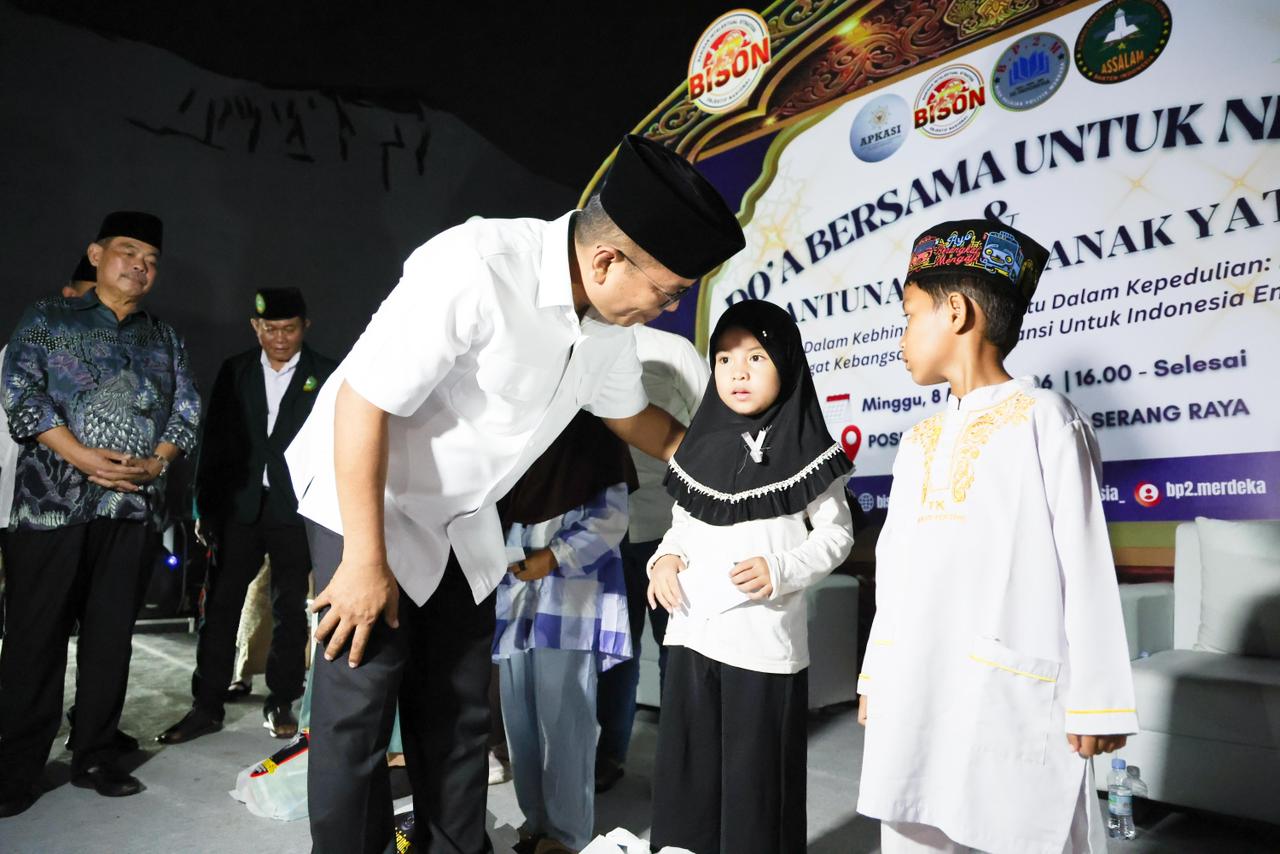 ​Hal tersebut disampaikan Andra Soni saat menghadiri kegiatan “Doa Bersama untuk Negara dan Santunan 1.000 Anak Yatim” yang diinisiasi oleh Barisan Intelektual Strategi Objektif Nasional (BISON) Indonesia di Cipocok Jaya, Kota Serang, Minggu (8/3/2026).