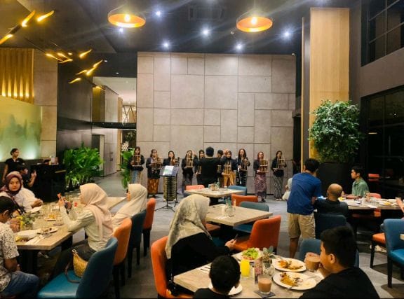 Pada malam harinya, Ivy Restaurant menghadirkan program spesial All You Can Eat Buffet Dinner dengan tema “Rasa dan Budaya” yang berlangsung dari pukul 18.00 WIB hingga 21.00 WIB, dan dimeriahkan oleh penampilan musik tradisional Angklung, menciptakan suasana makan malam yang hangat dan penuh nuansa kebudayaan.