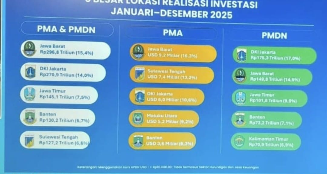 Capaian tersebut secara resmi diumumkan oleh Menteri Investasi dan Hilirisasi/Kepala Badan Koordinasi Penanaman Modal (BKPM), Rosan Perkasa Roeslani, dalam Rapat Koordinasi Nasional (Rakornas) Investasi dan Hilirisasi yang dihadiri secara Daring oleh Kepala Dinas Penanaman Modal dan Pelayanan Terpadu Satu Pintu (DPMPTSP) se-Indonesia, Kamis (15/1/2026).