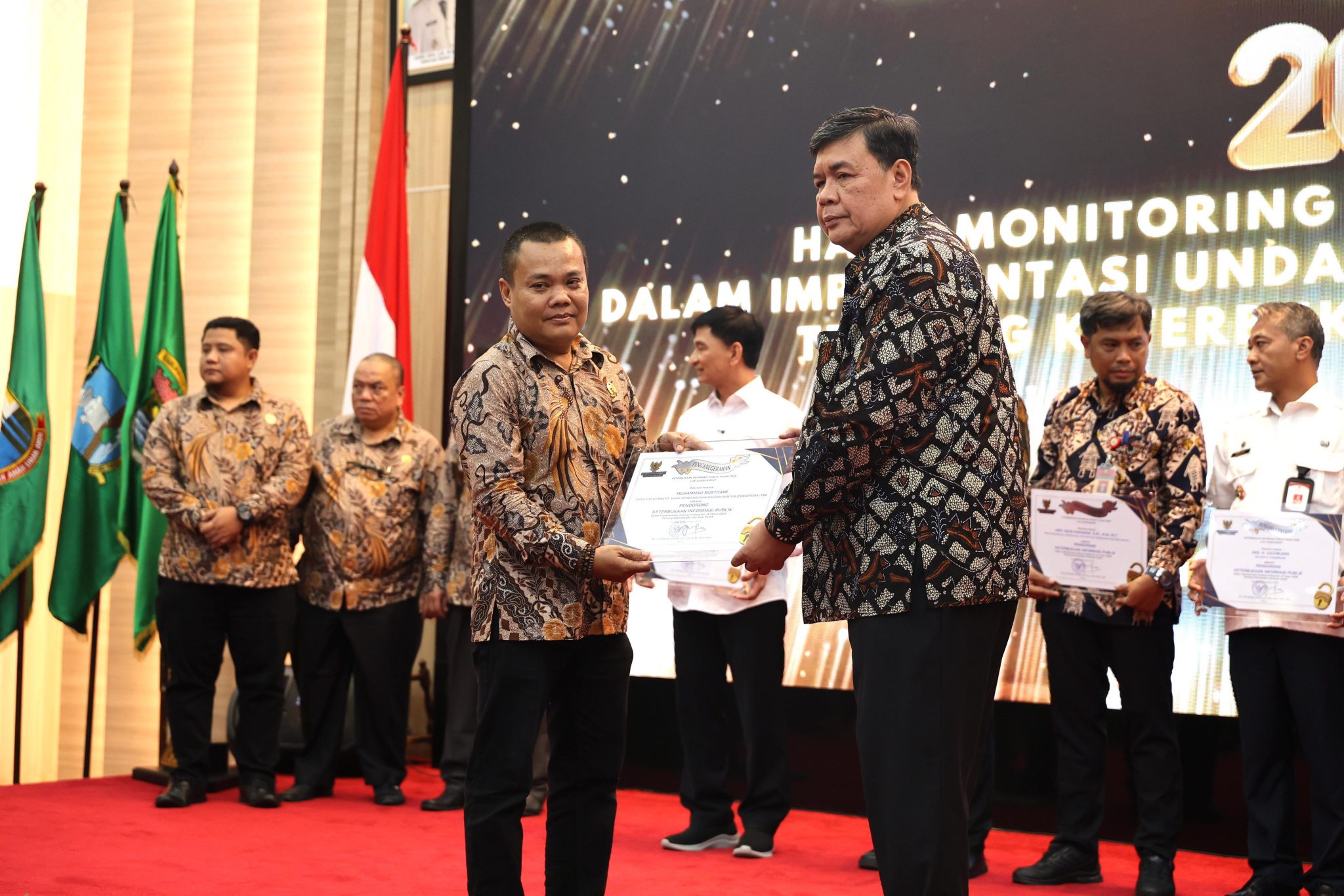 Penghargaan diserahkan oleh Komisi Informasi Provinsi Banten dengan disaksikan langsung oleh Ketua KI Pusat RI Donny Yoesgiantoro kepada Direktur Utama Bank Banten Muhammad Busthami dalam acara penganugerahan Keterbukaan Informasi Publik (KIP) tahun 2025 di Pendopo Gubernur Banten, KP3B, Kota Serang, Rabu (12/11/2025).
