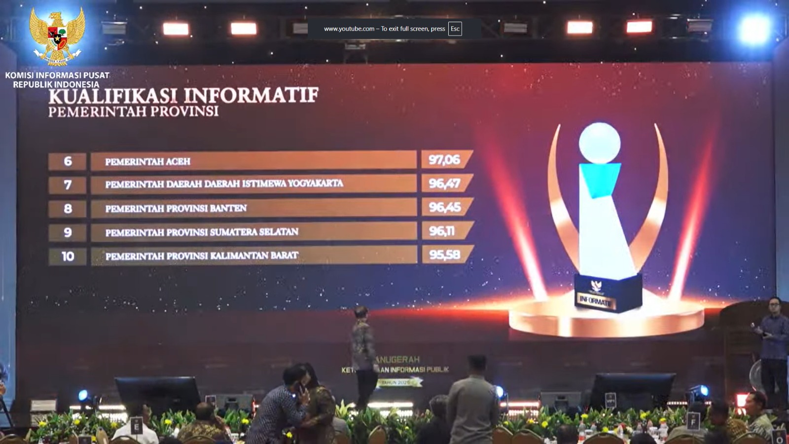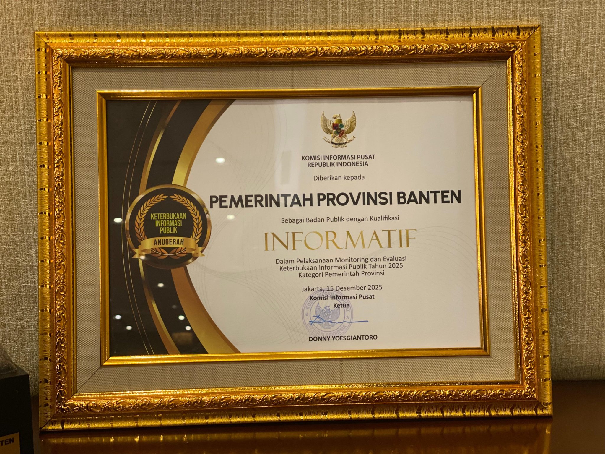 Penghargaan tersebut diserahkan pada puncak Anugerah Keterbukaan Informasi Badan Publik 2025 sekaligus peluncuran Indeks Keterbukaan Informasi Publik Tahun 2026 di Hotel Bidakara, Jakarta, Senin (15/12/2025). Dalam penilaian tersebut, Provinsi Banten meraih predikat Informatif dengan skor 96,45 dan berhasil masuk urutan delapan dari 21 provinsi yang meraih predikat informatif.