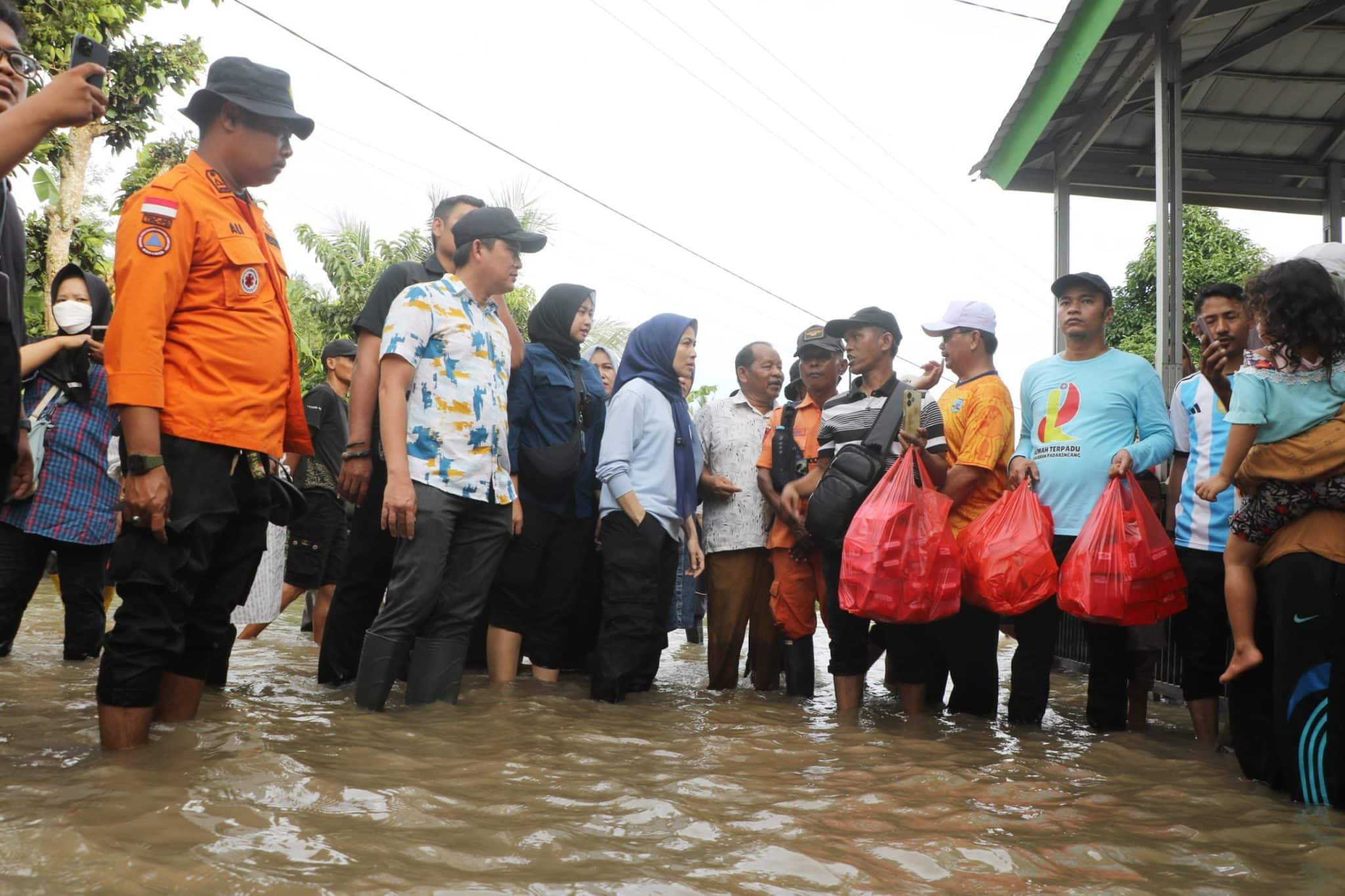 Kemudian, Ratu Zakiyah melanjutkan menyusuri banjir dengan ketinggian air selutut orang dewasa yang masih merendam ratusan rumah di Kampung Kajeroan, sejak Rabu, 17 Desember 2025 malam. Terlihat, warga lebih memilih bertahan di rumahnya masing-masing meski sulit untuk beraktivitas.