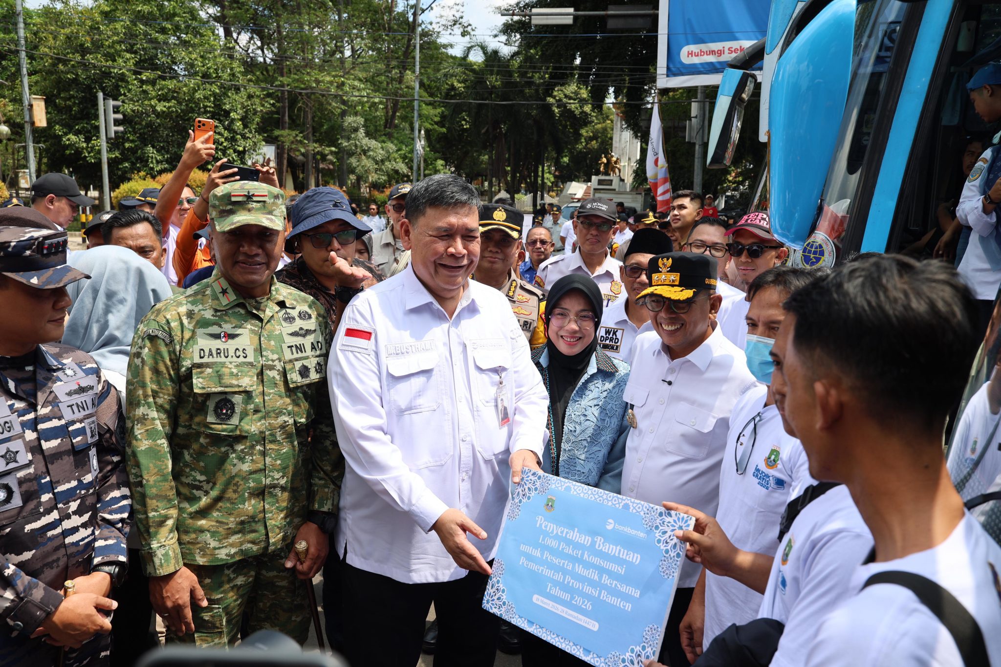 Rombongan pemudik dilepas langsung oleh Gubernur Banten Andra Soni, didampingi Sekretaris Daerah Provinsi Banten Deden Apriandhi, Kepala Dinas Perhubungan Provinsi Banten Tri Nurtopo, serta Direktur Utama Bank Banten Muhammad Busthami bersama jajaran OPD Provinsi Banten. Pelepasan berlangsung di Alun-alun Kota Serang pada Rabu (18/03/2026).